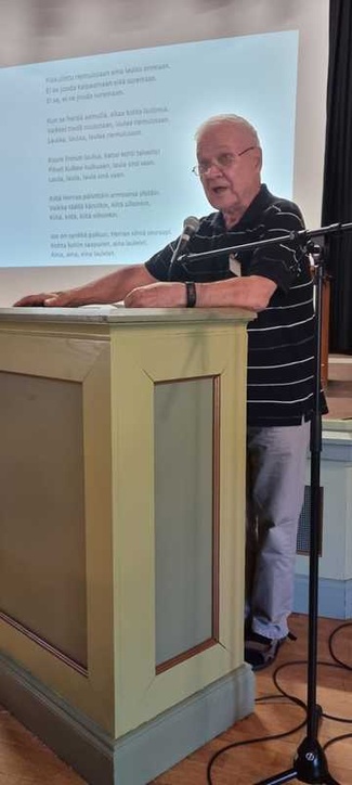 Ohjelmassa oli perinteiseen tapaan puheita ja yhteislaulua. Ahti Peltonen kertoi rakkaasta lintuharrastuksestaan. Kuulimme, kuinka hän on osallistunut lintujen talvisiin linjalaskentoihin yli 30 vuotena. Harvinaisin havainto on ollut viitatiainen, jonka Ahti havaitsi yllättäen oman pihan ruokintapaikalla oman pihan ruokintapaikalla Ala-Räävelin rannalla 27.9.1995 . Suomessa oli tehty vain muutama havainto lajista ennen tätä. Sittemmin laji on yleistynyt Suomessa. Ahti myös kertoi, että hänestä pönttö on ihan pönttö sana ja sen sijasta hän käyttää mieluummin uuttu sanaa. ”Eihän uuttukyyhkyhän ole pönttöpulu” Ahti totesi naurahtaen. Kuulimme myös, että outo ääni pihallamme voi hyvinkin olla talitiaisen; sillä on tutun ti-ti-tyyn lisäksi yli 80 muuta ääntä.