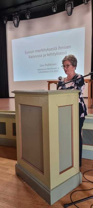 Professori Lea Pulkkinen kertoi suvun merkityksestä ihmisen kasvussa ja kehityksessä. Kaikille ihmisille on erittäin tärkeää, että tunnemme kuuluvamme johonkin. Ystävyyssuhteet voivat elämäntilanteen muuttuessa katketa, mutta suku säilyy. Jokaisella suvulla on omat tarinansa. Ne voivat olla voimaannuttavia tai traagisia. Useissa Marttusen suvun tapaamisissa on käyty läpi suvun kantavanhempien Valmi Hjalmarin ja Julia Marttusen elämänvaiheita ja arvojaan. Uskomattomalta on nuoremman ja vanhemmankin polven korvissa kuulostanut heidän tarinansa ja tarmokkuutensa. He muuttivat Heinolan maalaiskuntaan talvella 1922 vähän yli kolmekymppisinä. Junalla matkustettiin Pohjanmaalta Lahteen ja sieltä talvipakkasissa suuren lapsikatraan, palvelusväen ja tavaroiden kanssa hevosrattailla Lusin kylässä sijaitsevaan kartanoon. Perheeseen kuului tuolloin vanhempien lisäksi seitsemän lasta, joista vanhin oli 12-vuotias. Myöhemmin lapsia syntyi vielä seitsemän lisää. Vajaassa 20 vuodessa kartano saatiin kukoistamaan, Syrjäkosken saha uudistettua ja meijeri perustettua. Valmi Hjalmarilla oli tilan puuhien lisäksi lukuisia luottamustoimia. Lea kannusti tutustumaan yhdessä nuoremman polven kanssa suvun kiinnostaviin vaiheisiin. Siihen tarjoavat hyvän mahdollisuuden kaksi sukukirjaa, joista tuoreempi on vuodelta 2020. Lealta on ilmestynyt tänä vuonna kaksi kirjaa, joista toisessa hän perustelee sitä, miksi lapsen hyvinvointi alkaa kodista, ja toisessa hahmottelee tutkijan omakuvaa elämänkaaren asemesta jänteenä, joka koostuu lukuisista toisiinsa limittyvistä säikeistä. Lean puhe on kokonaisuudessaan tämän sivun lopussa.