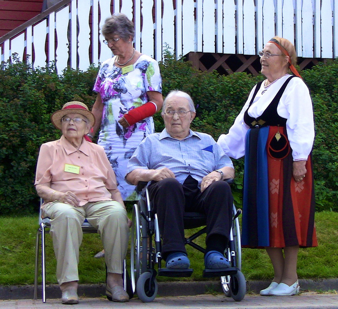 ![]() Suvun vanhimmat, Annikki ja Aate Marttunen ja reipas Annikki Kivioja kansallispuvussaan. Takana Lea Pulkkinen. |
