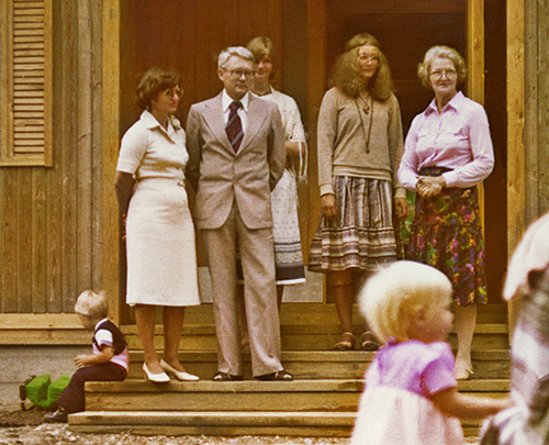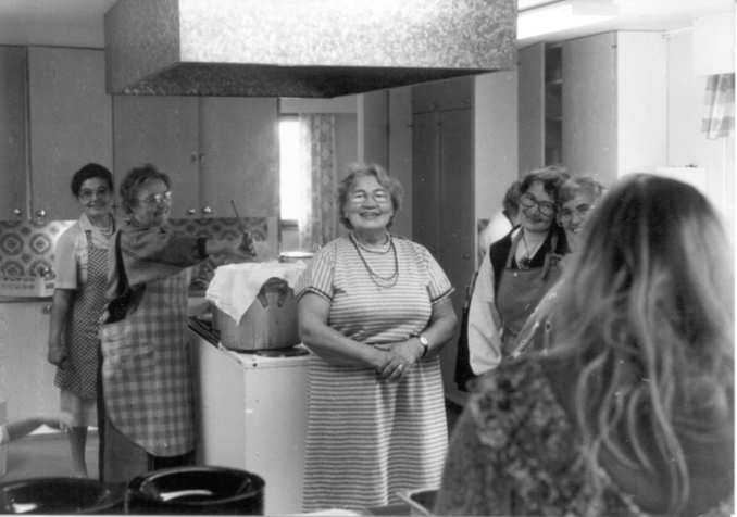 ![]() Ensimmäisissä sukujuhlissa 1. sukupolven reippaat neitokaiset vastasivat emännönnistä. Keskellä pirteä Aini. |